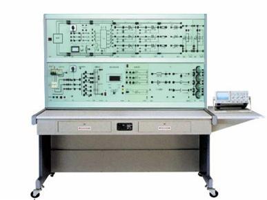 实验桌为铁质双层亚光密纹喷塑结构,桌面为防火、防水、耐磨高密度板;左右设有两个大抽屉(带锁),用于放置工具及资料。右边设有放置示波器用的可拆卸搁板。